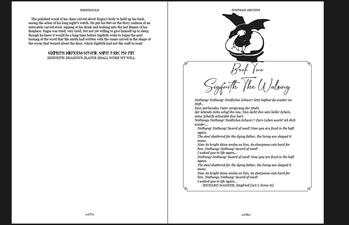 Grundy tells his version of the saga of Sigifrith's heroic ancestry and of the cursed treasure guarded by the dragon Fadhmir. touching on Sigifrith's coming of age, gaining a steed and a sword worthy of a hero, and of his deeds including revenge for his father's death, and slaying the dragon Fadhmir while taking possession of the great treasure. Ending in his tragic destiny as it forces him into an impossible choice between two women: Gundrun, a powerful king's daughter, his betrothed; and Brunichild, who believes herself to be his destined soulmate.